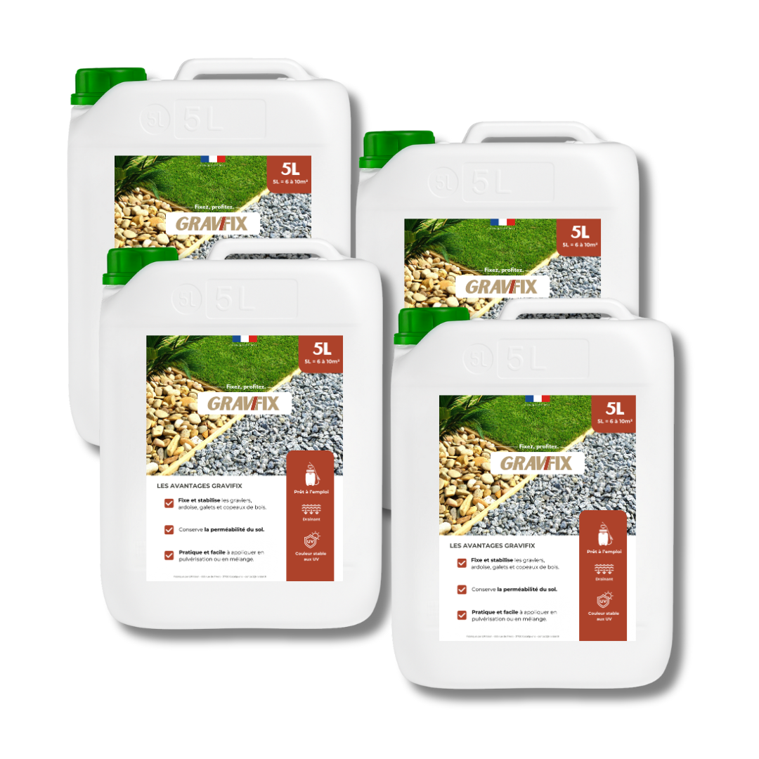 Gravifix® – Lot de 4 bidons (20L) – Fixateur de graviers, galets & paillis